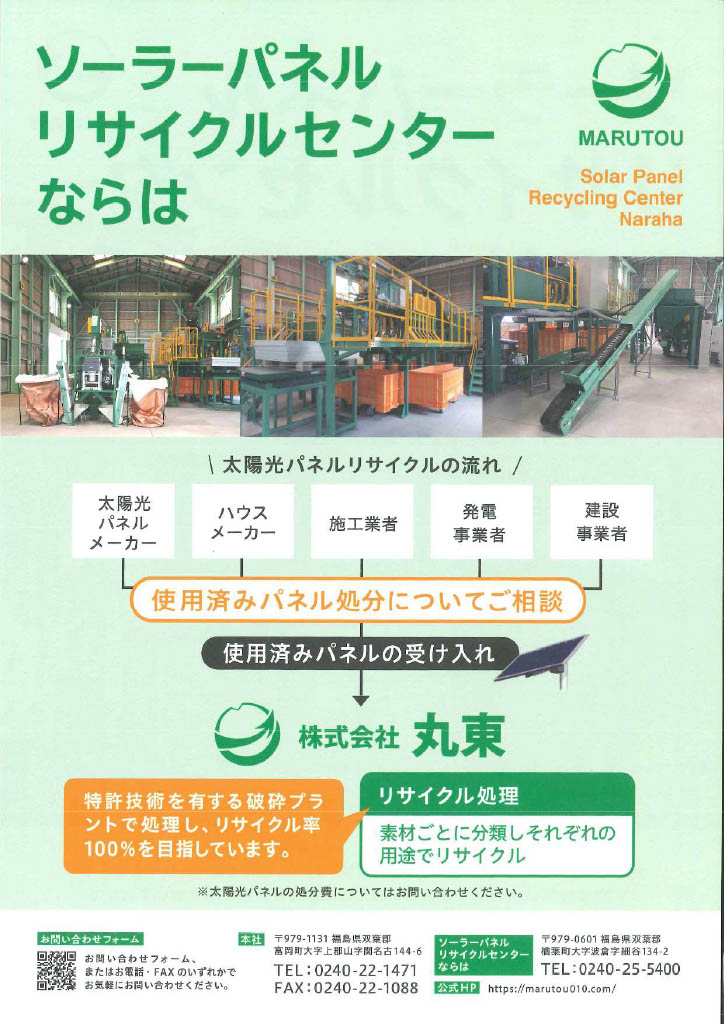 ソーラーパネルリサイクルセンターならは 問い合わせ先 楢葉リサイクルセンター(0240-25-5177)
